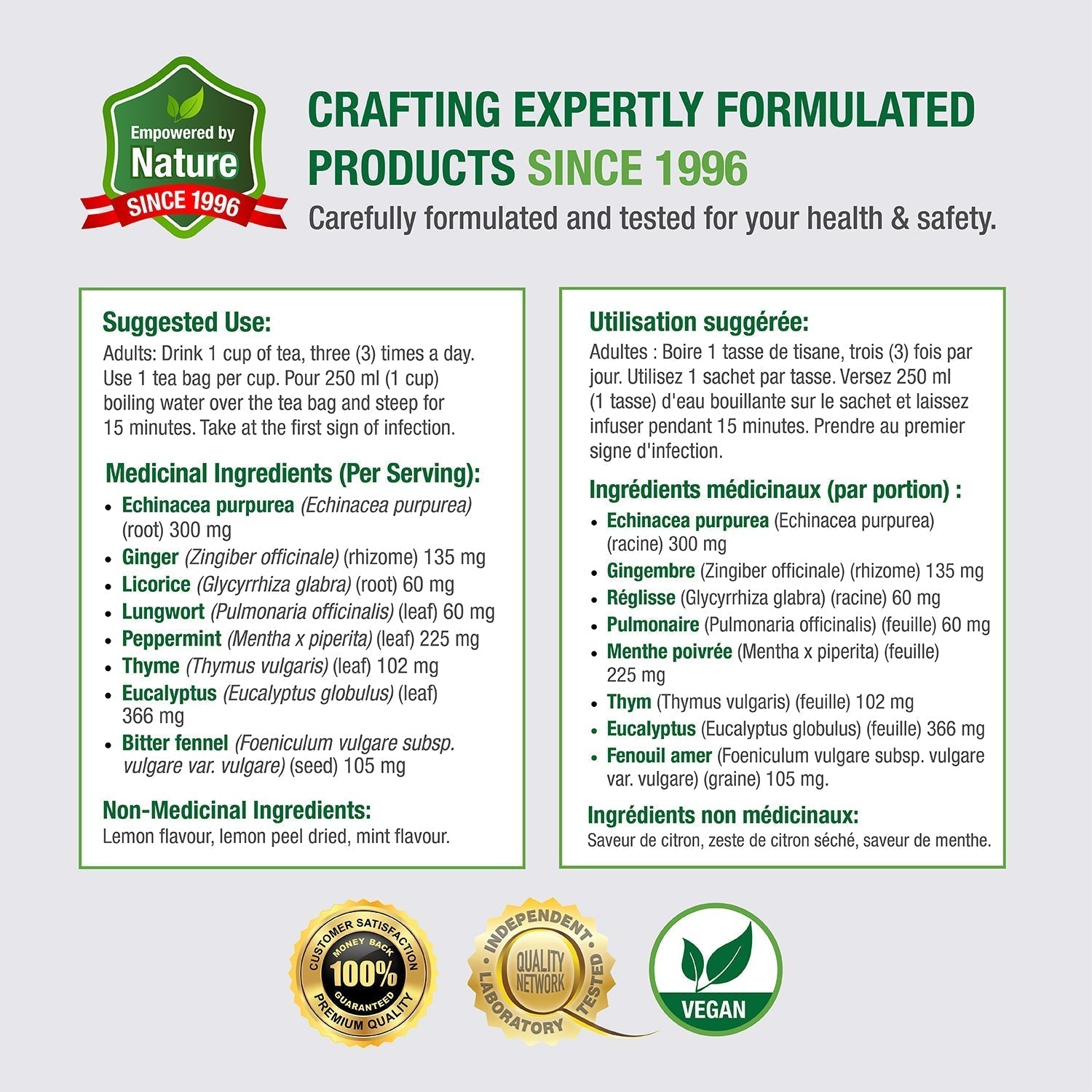 Suggested Use: Adults: Drink 1 cup of tea, three (3) times a day. Use 1 tea bag per cup. Pour 250 ml (1 cup) boiling water over the tea bag and steep for 15 minutes. Take at the first sign of infection.