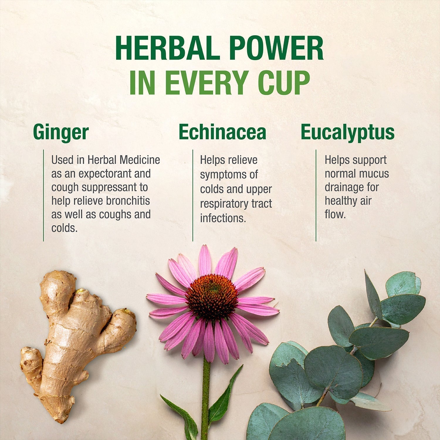 • Ginger traditionally used in Herbal Medicine as an expectorant and cough suppressant (antitussive) to help relieve bronchitis as well as coughs and colds.